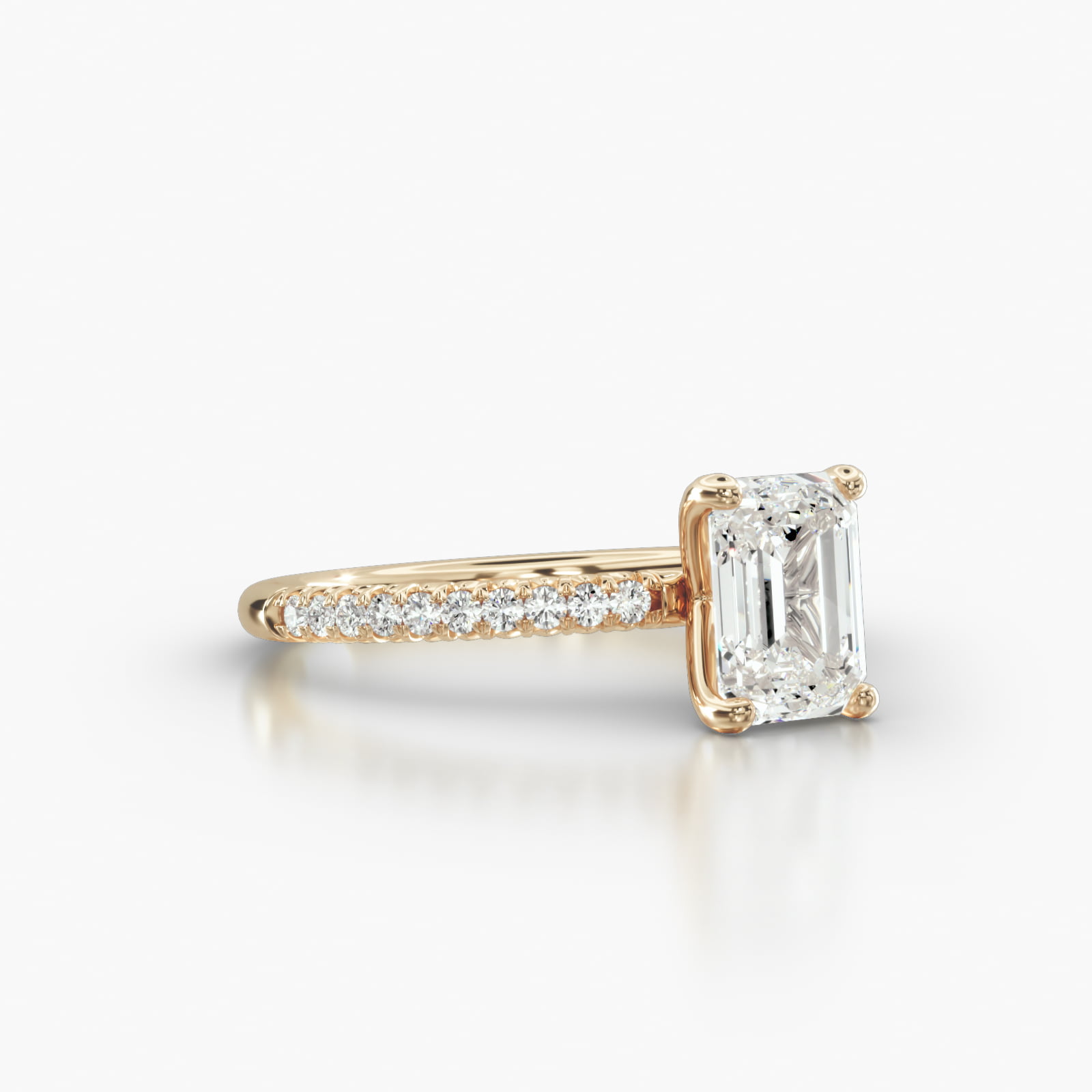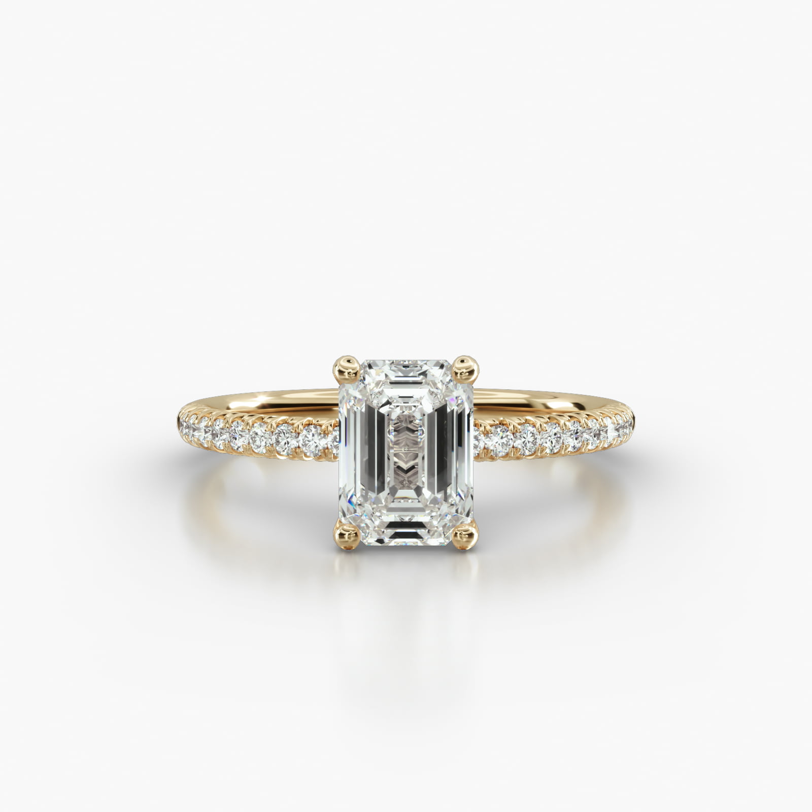 Timeless and sophisticated, this flush-fit shank exudes understated elegance and exceptional comfort while showcasing the center diamond. The design is enhanced by a delicate and refined Four Prong Signature Head, adding a touch of sophistication to this Emerald Cut diamond engagement ring.
