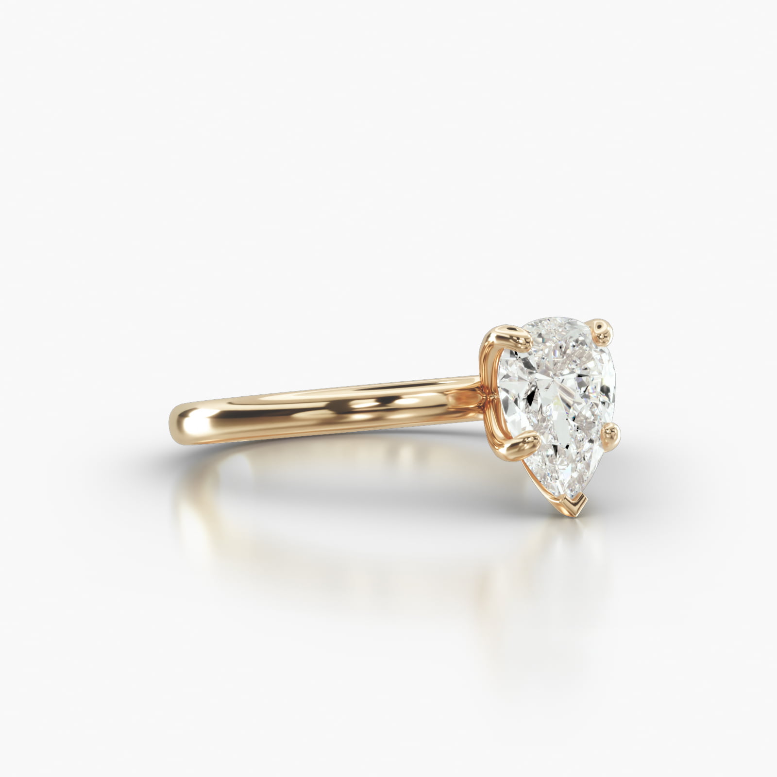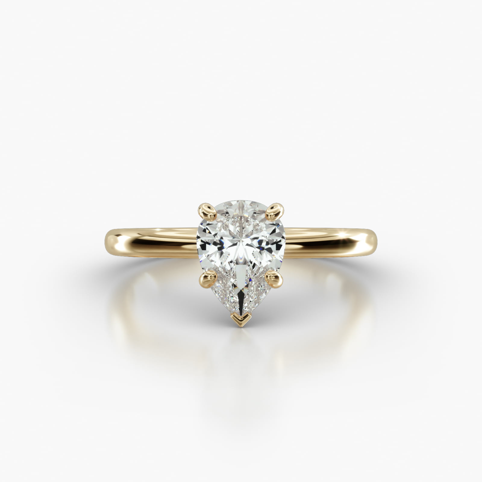 Timeless and sophisticated, this flush-fit shank exudes understated elegance and exceptional comfort while showcasing the center diamond. The design is enhanced by a delicate and refined Five Prong Signature Head, adding a touch of sophistication to this Pear Cut diamond engagement ring.